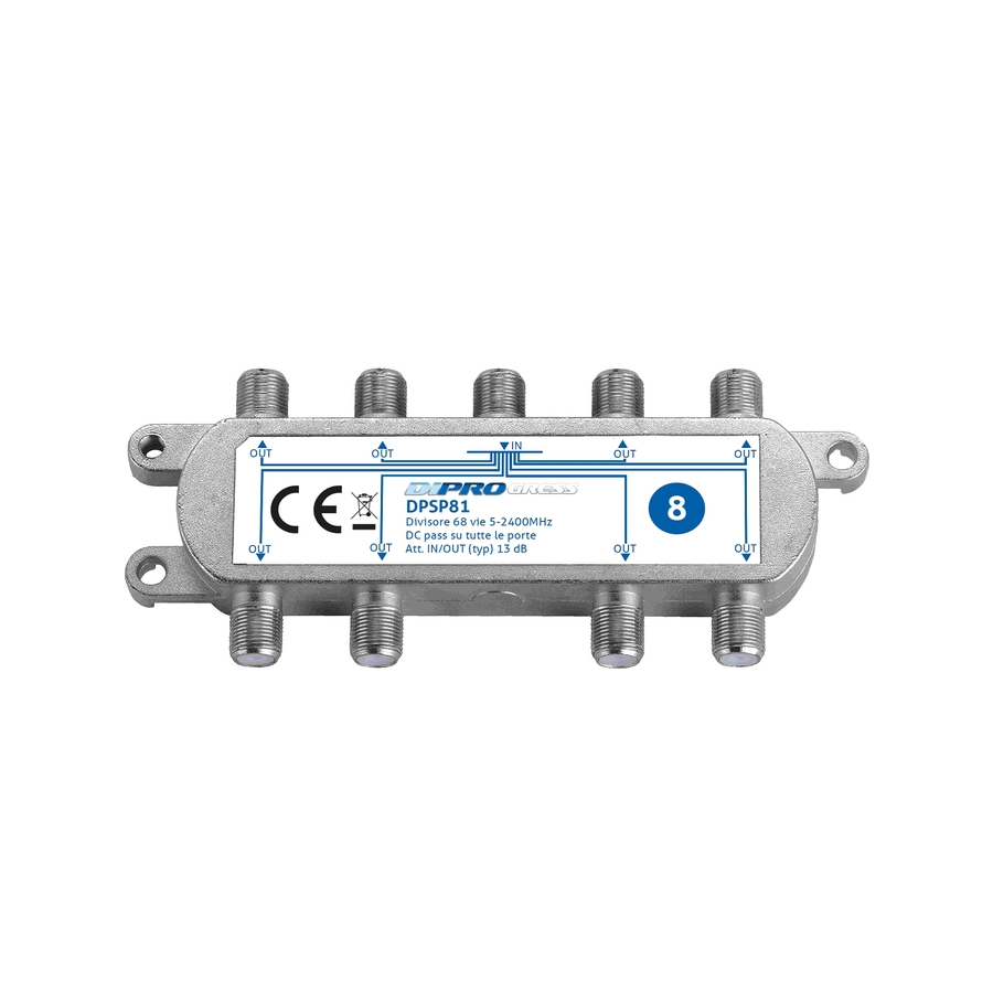 Partitori in pressofusione TV+SAT con connettori F( divisore 8 vie DIPROGRESS) Partitori serie F realizzati in pressofusione completamente schermata Connettori F allineati per garantire minimo ingombro,con basse perdite e ottimo disaccoppiamento passaggio DC su tutte le uscite.