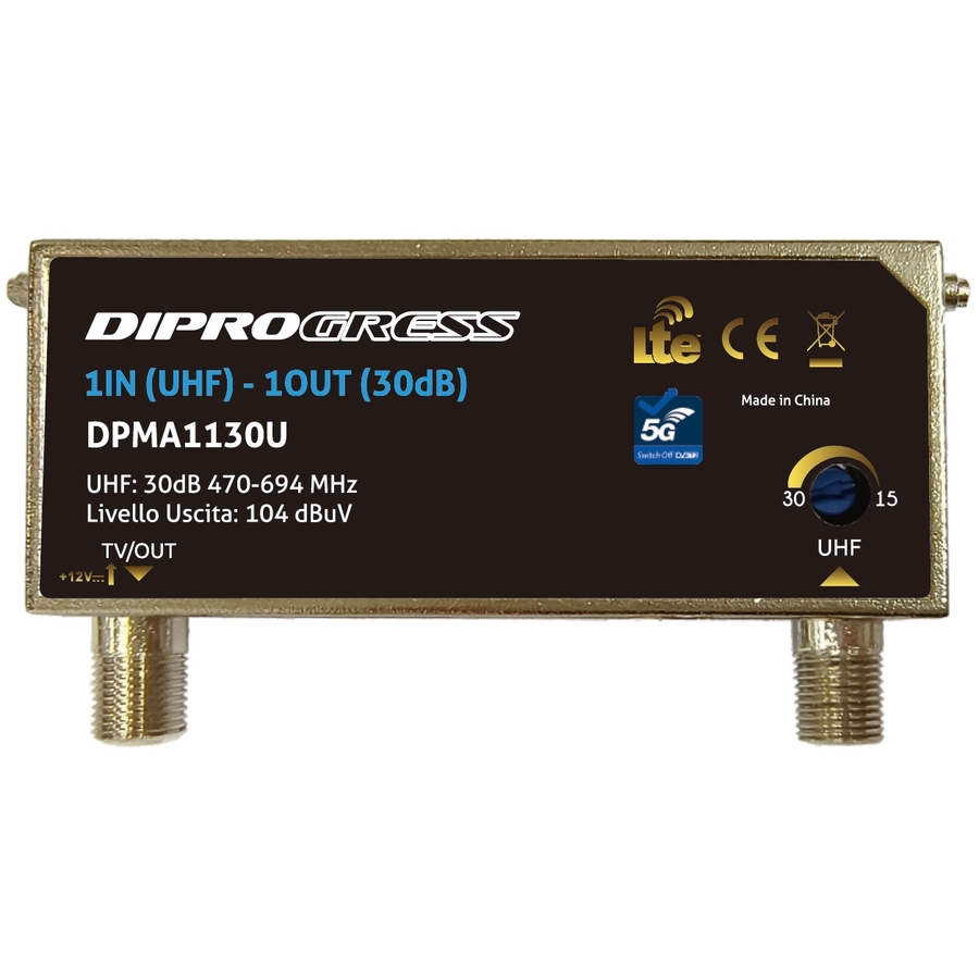 Centralini da palo, amplificatori logaritmici full band 5G LTE READY -Singola USCITA Amplificatori da palo singolo ingresso UHF per amplificare segnali provenienti da 1 antenna TV. Case metallico in custodia plastica ABS impermeabile, adatta a installazione in esterno; Alimentazione 12V in continua tramite connettore di uscita; Banda UHF con filtro LTE. Regolazione 20 dB Guadagno 30db. livello uscita: 108 dBuV SWITCH OFF READY: Filtro LTE 5G (694MHz) integrato
