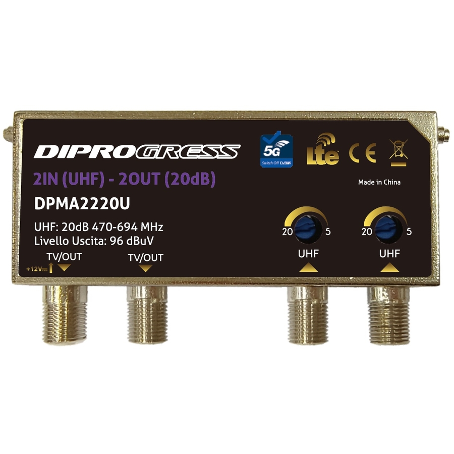 Centralini da palo, amplificatori logaritmici full band 5G LTE READY -2 USCITE Amplificatore da palo Doppio ingresso UHF per amplificare segnali provenienti da 2 antenne TV. Case metallico in custodia plastica ABS impermeabile, adatta a installazione in esterno; Alimentazione 12V in continua tramite connettore di uscita; Banda UHF con filtro LTE 5G. Regolazione 12 dB separata del guadagno nelle due bande guadagno 20db. livello uscita: 100 dBuV SWITCH OFF READY: Filtro LTE 5G (694MHz) integrato