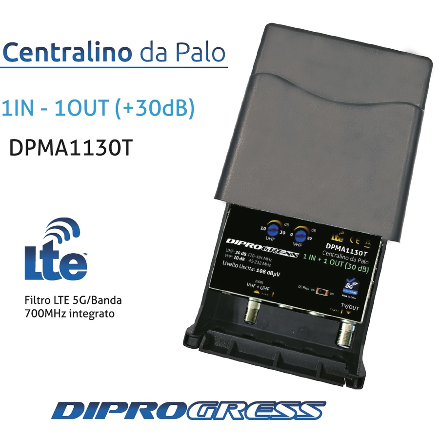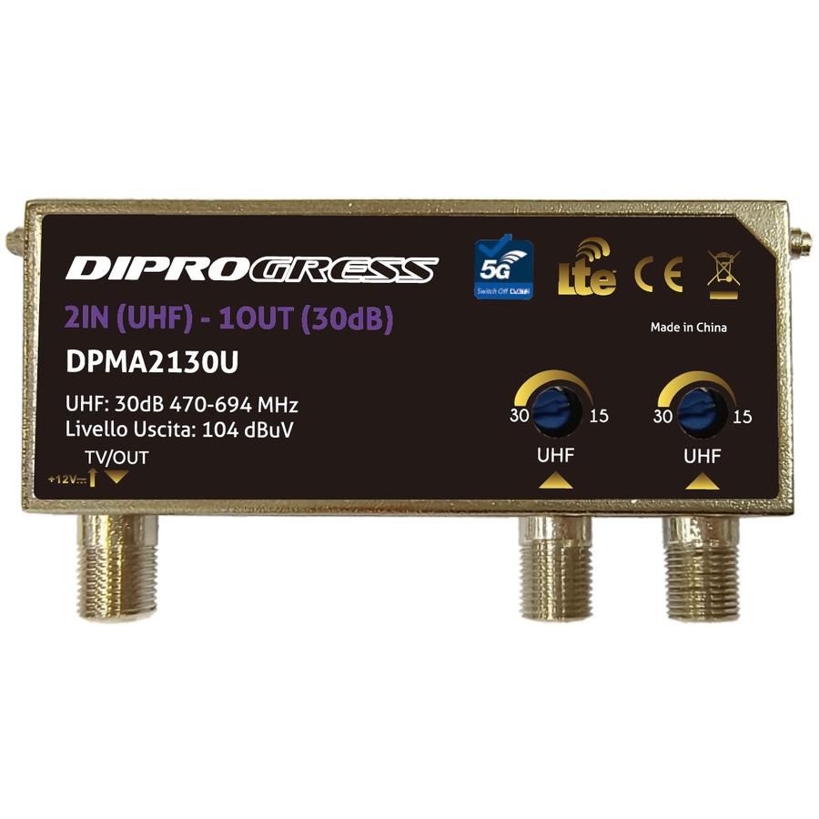 Centralino da palo con amplificatore banda UHF 5G LTE READY -Singola USCITA Amplificatore da palo Doppio ingresso UHF per amplificare segnali provenienti da 2 antenne TV. Case metallico in custodia plastica ABS impermeabile, adatta a installazione in esterno; Alimentazione 12V in continua tramite connettore di uscita; Banda UHF con filtro LTE 5G. Regolazione 20 dB separata del guadagno nelle due bande guadagno 30dB. livello uscita: 108 dBuV SWITCH OFF READY: Filtro LTE 5G (694MHz) integrato
