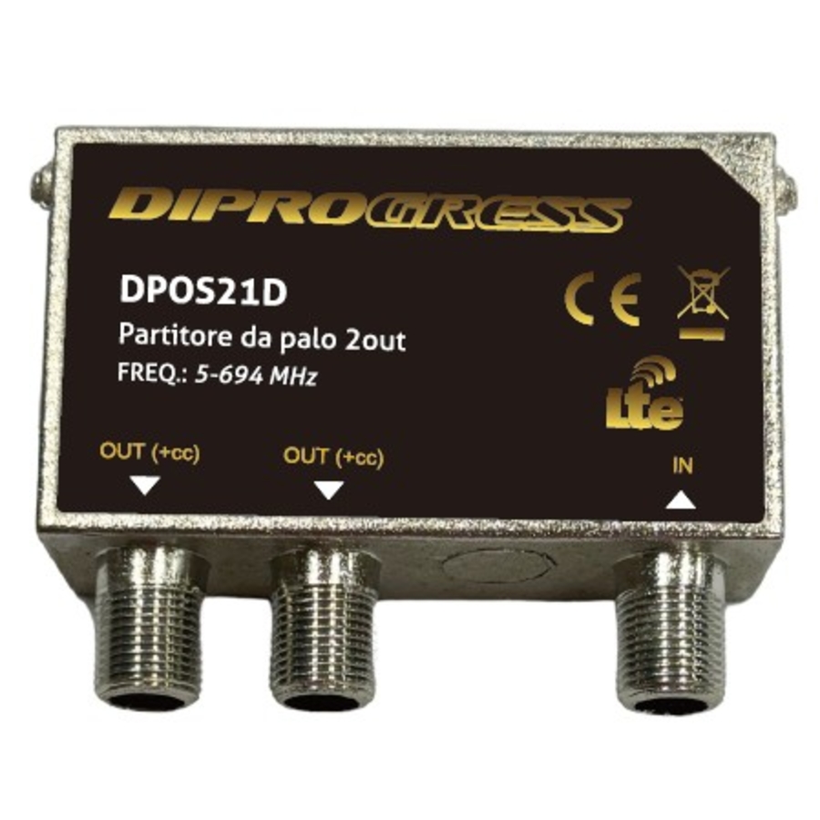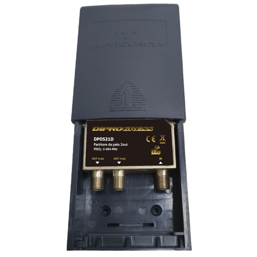 Partitore in pressofusione TV con connettori F Partitore da Palo da esterno, con scatola impermeabile inclusa Divisore 2 vie attenuazione <4dB Banda passante 5-694 MHz con filtro per i segnali 5G/LTE Passaggio di corrente DC per preamplificatori o antenne amplificate su TUTTE le uscite Realizzato in pressofusione completamente schermata Serie DiProgress Digitale Terrestre