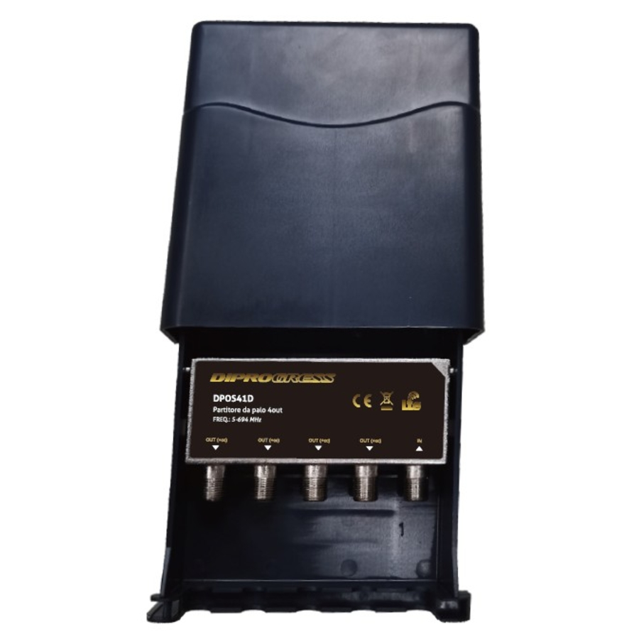 Partitore in pressofusione TV con connettori F Partitore da Palo da esterno, con scatola impermeabile inclusa Divisore 4 vie attenuazione <7dB Banda passante 5-694 MHz con filtro per i segnali 5G/LTE Passaggio di corrente DC per preamplificatori o antenne amplificate su TUTTE le uscite Realizzato in pressofusione completamente schermata Serie DiProgress Digitale Terrestre