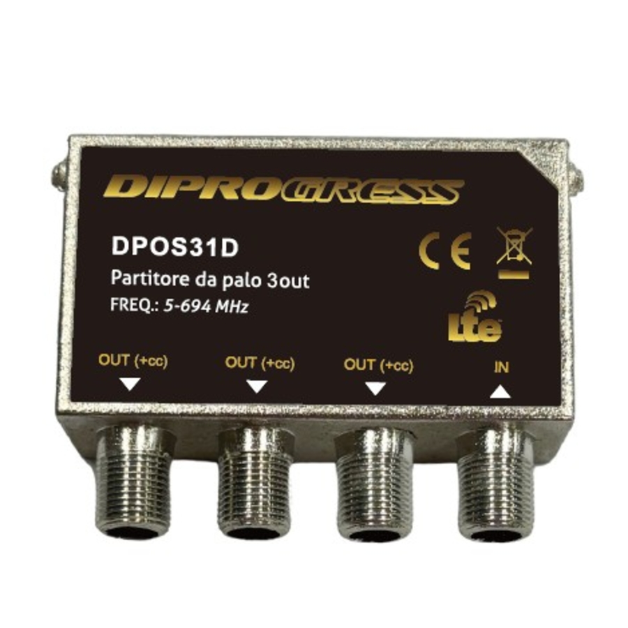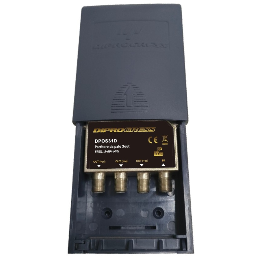 Partitore in pressofusione TV con connettori F Partitore da Palo da esterno, con scatola impermeabile inclusa Divisore 3 vie attenuazione <6dB Banda passante 5-694 MHz con filtro per i segnali 5G/LTE Passaggio di corrente DC per preamplificatori o antenne amplificate su TUTTE le uscite Realizzato in pressofusione completamente schermata Serie DiProgress Digitale Terrestre