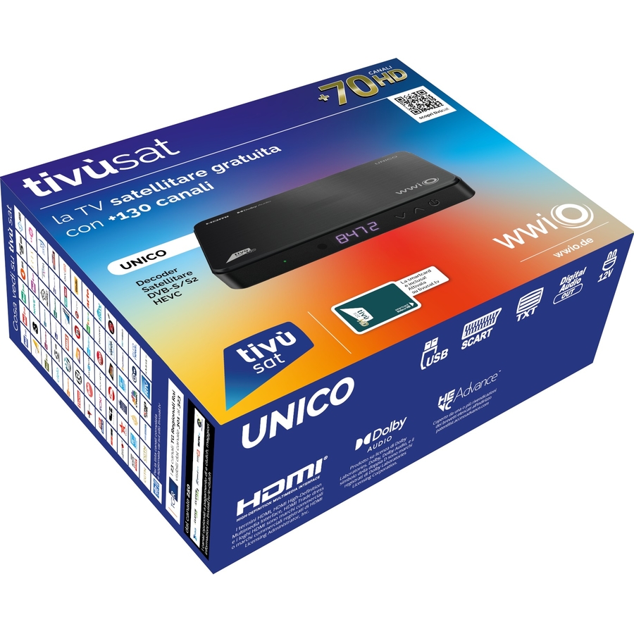 Decoder tivùsat Classic WWIO UNICO PRO BLACK (DVB-S2 e HEVC) NOVITA' DISPONIBILE DA GENNAIO 2026 Accesso completo all’offerta canali tivùsat, la piattaforma gratuita con 50+ canali HD e i migliori canali italiani e internazionali Ricevitore Digitale Full HD DVB-S2 MPEG2/MPEG4/ HEVC10bit Smart Card tivùsat HD inclusa nella confezione Compatibile con LNB SCR e dCSS (digital SCR) fino a 16UB Compatibile con LNB universale e multifeed Lettore Smart Card (tivùsat, Nagravision) Uscita HDMI Full HD, Uscita Scart per TV tradizionali, porta Ethernet 10/100 Player Multimediale HEVC, via USB Accesso a tutti i canali TivùSat SD e HD e ai canali stranieri gratuiti via satellite Telecomando Universale per controllo Decoder e TV Tasti CH+/CH- e accensione su frontalino Display frontale Ordinamento canali automatico con funzione Easy HD tivùsat Guida Elettronica Programmi EPG tivùsat Aggiornamento automatico canali tivùsat Aggiornamento software via OTA/USB Alimentazione 12V DC Audio MPEG Layer I e II, AAC+, Dolby Audio (compatibile Dolby Digital Plus), Down-mix stereo Menu Multilingua, Teletext, Sottotitoli, Multiaudio