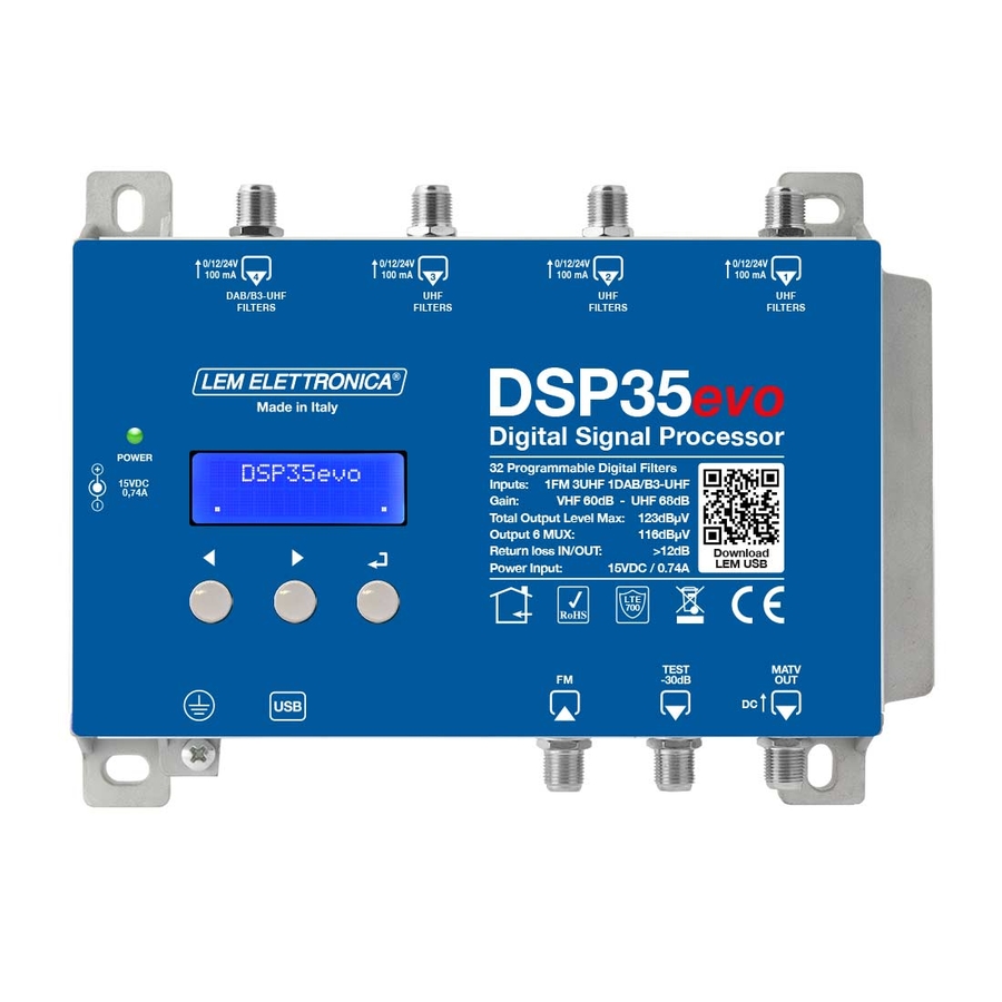 DSP35evo Centrale di amplificazione multi-ingresso con filtri digitali programmabili per l’equalizzazione e la conversione in frequenza di MUX DVB-T/T2 del digitale terrestre. L’elevato livello di uscita e la versatilità delle sue funzioni la rendono adatta ad un’ampia tipologia d’impianti di medie e grandi dimensioni. Caratteristiche Livello di uscita totale Max. 123dBµV 32 Filtri digitali programmabili con controllo automatico del guadagno Filtri digitali con selettività = 50dB Filtri a banda selezionabile per singolo filtro Pre-amplificatori d’ingresso a doppio stadio Filtri Lte700 per protezione interferenze 4/5G Ingresso UHF4 21-48 / 21-69 Auto-tuning per la scansione automatica dei canali Porta USB per aggiornamenti e programmazione da App Alimentatore switching esterno ad alta efficienza classe VI Struttura in pressofusione in lega di zama