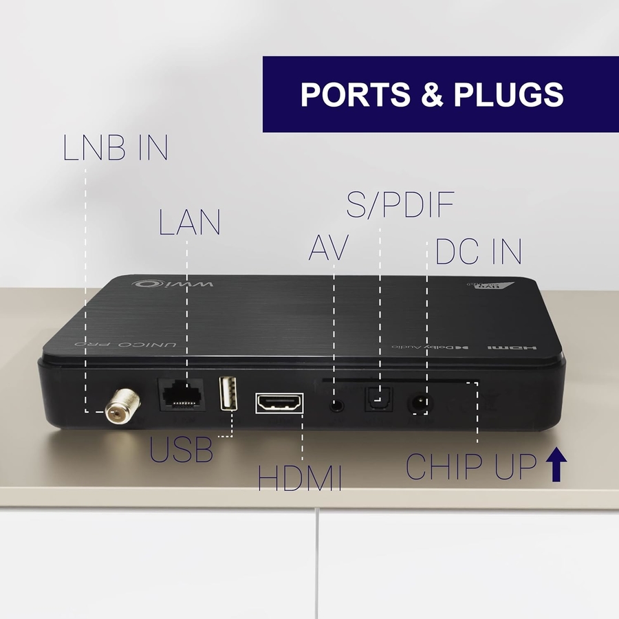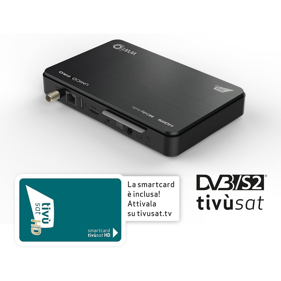 Decoder tivùsat Classic WWIO UNICO PRO BLACK (DVB-S2 e HEVC) NOVITA' DISPONIBILE DA GENNAIO 2026 Accesso completo all’offerta canali tivùsat, la piattaforma gratuita con 50+ canali HD e i migliori canali italiani e internazionali Ricevitore Digitale Full HD DVB-S2 MPEG2/MPEG4/ HEVC10bit Smart Card tivùsat HD inclusa nella confezione Compatibile con LNB SCR e dCSS (digital SCR) fino a 16UB Compatibile con LNB universale e multifeed Lettore Smart Card (tivùsat, Nagravision) Uscita HDMI Full HD, Uscita Scart per TV tradizionali, porta Ethernet 10/100 Player Multimediale HEVC, via USB Accesso a tutti i canali TivùSat SD e HD e ai canali stranieri gratuiti via satellite Telecomando Universale per controllo Decoder e TV Tasti CH+/CH- e accensione su frontalino Display frontale Ordinamento canali automatico con funzione Easy HD tivùsat Guida Elettronica Programmi EPG tivùsat Aggiornamento automatico canali tivùsat Aggiornamento software via OTA/USB Alimentazione 12V DC Audio MPEG Layer I e II, AAC+, Dolby Audio (compatibile Dolby Digital Plus), Down-mix stereo Menu Multilingua, Teletext, Sottotitoli, Multiaudio