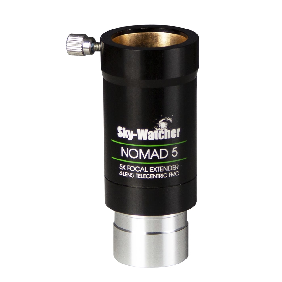 Nomad – Lente di Barlow 5X APO a 4 Elementi Lente di Barlow 5x Apocromatica con 4 elementi ottici, anello autocentrante di bronzo e raccordi adattatori DSLR e camera CCD integrati nel corpo metallico. Descrizione Lente di Barlow apocromatica Sky-Watcher NOMAD 5x dotata di ben 4 elementi ottici e sistema di chiusura con anello di bronzo autocentrante per oculari da 31.8mm. Ogni superficie è caratterizzata da un trattamento multistrato proprietario che garantisce nel complesso eccellenti proprietà di trasmissione luminosa ed immagini con altissimi livelli di luminosità e contrasto. Nel gruppo ottico composto da 4 elementi è presente anche vetro a bassa dispersione che consente di ridurre drasticamente la quantità di aberrazione cromatica. Le filettature e i bordi della lente sono anneriti per rimuovere riflessi indesiderati. Grazie a questa lente di barlow 5X APO sarà possibile catturare spettacolari immagini di pianeti e della Luna senza compromettere la qualità ottica dello strumento. La lente di barlow 5X NOMAD Sky-Watcher dispone di raccordi adattatori integrati nel corpo di metallo per il collegamento di camere DSLR e camere CCD, nonchè di alloggiamento per filtri da 31.8mm di diametro. CARATTERISTICHE Schema Ottico Apocromatico con vetri ED a Bassa Dispersione Numero Lenti/Gruppi 4 elementi Trattamento Antiriflesso su ogni Superficie Materiale Costruzione Metallo Diametro Barilotto 31,8mm Raccordi DSLR e CCD